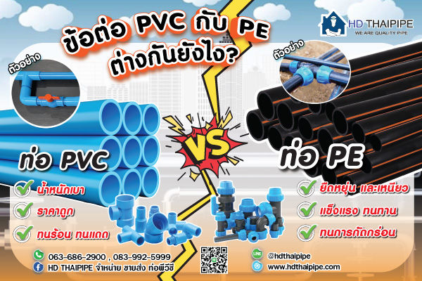 นอกจากข้อต่อท่อ PE นั้นไม่ได้เป็นข้อต่อเพียงชนิดเดียวในท้องตลาด เพราะที่จริงยังมีข้อต่อแบบ PVC ให้เลือกใช้กันอีกด้วย ซึ่งในส่วนของท่อที่ใช้วัสดุทั้ง 2 ชนิดนั้นมีความสามารถที่คล้ายคลึงกันเป็นอย่างมาก แต่จะมีรายละเอียดบางส่วนที่แตกต่างกัน ดังนี้