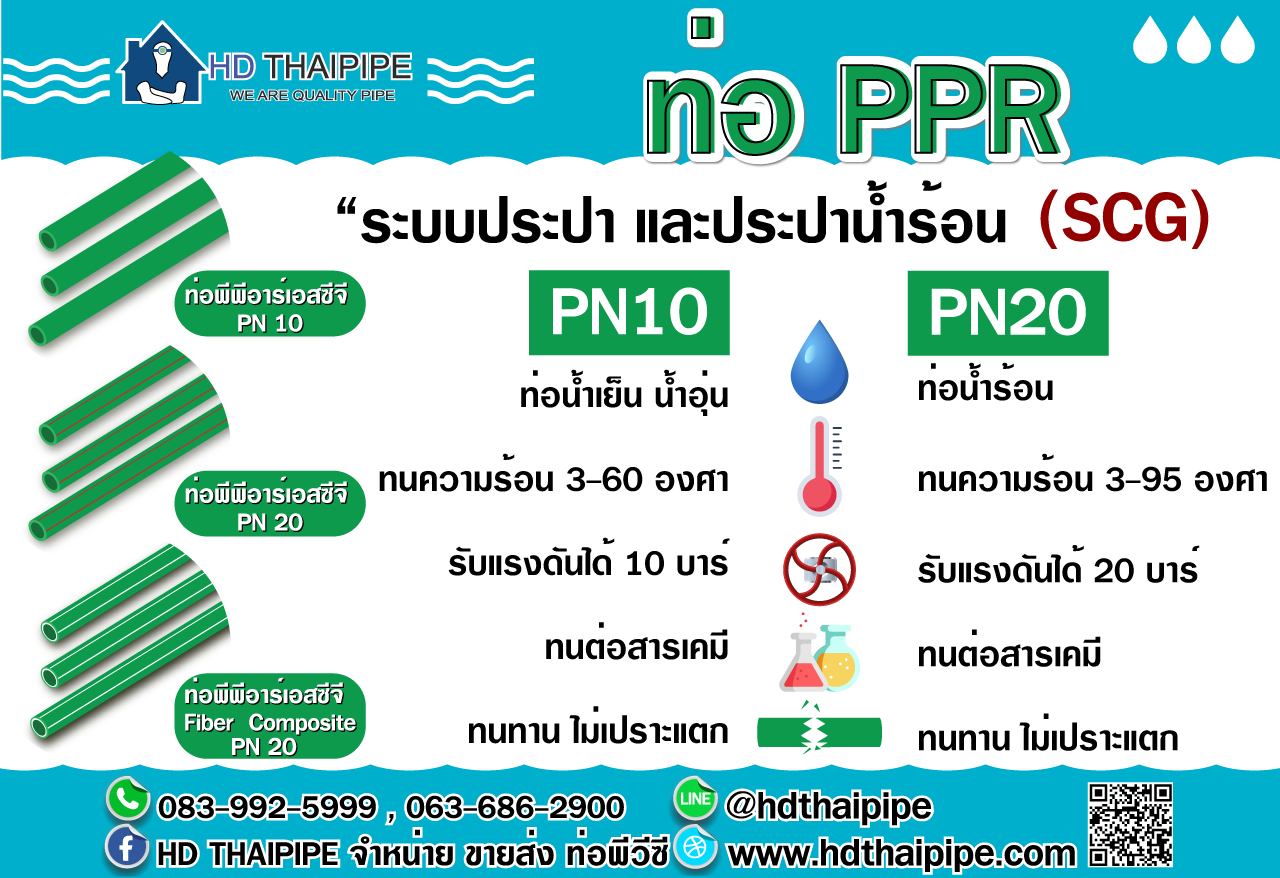 - ระบบน้ำร้อน 95 องศา - ท่อประปาอย่างท่อพีวีซีไม่สามารถทนความร้อนได้ดี และท่ออย่างท่อเหล็กก็เป็นวัสดุก่อสร้างสมัยเก่าที่หนักและเกิดสนิมได้ง่าย ท่อPPR เป็นตัวเลือกแบบใหม่สำหรับคนที่อยากติดตั้งระบบน้ำอุ่นน้ำร้อนในอาคาร ท่อPPR PN10 มีไว้สำหรับน้ำอุ่น และ PN20 คือสำหรับน้ำร้อน เราควรเลือกท่อให้เหมาะกับการใช้งาน หากเลือกสเปคท่อสูงเกินไป ค่าใช้จ่ายของโครงการก็จะแพงเกินใชเหตุ